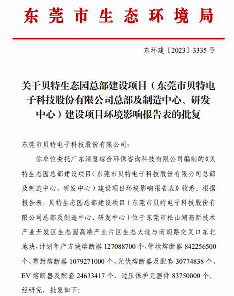 “經審查,該報告表存在以下主要問題:項目源強核算、基礎概況、工程分析、環境保護措施等相關問題不完善。鑒于上述問題,我局決定不予批準該項目的環境影響評價文件。根據《環境影響評價法》第二十五條規定,建設項目的環境影響評價文件未依法經審批部門審查或者審查后未予批準的,建設單位不得開工建設。你單位如不服本審查意見的決定,可依法提起行政復議或行政訴訟。”《關于貝特生態園總部建設項目(東莞市貝特電子科技股份有限公司總部及制造中心、研發中心)環境影響報告表審查意見的函》如是稱。