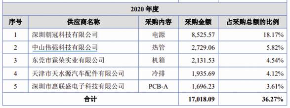 其中,2020年,公司的前五大供應(yīng)商分別為深圳朝冠科技有限公司、中山偉強(qiáng)科技有限公司、東莞市霖榮實(shí)業(yè)有限公司、天津市天水源汽車配件有限公司、深圳市惠聯(lián)盛電子科技有限公司,公司分別向其采購8525.57萬元、2729.06萬元、2131.53萬元、1935.69萬元、1696.23萬元,占采購金額的比例分別為18.17%、5.82%、4.54%、4.12%、36.27%。
