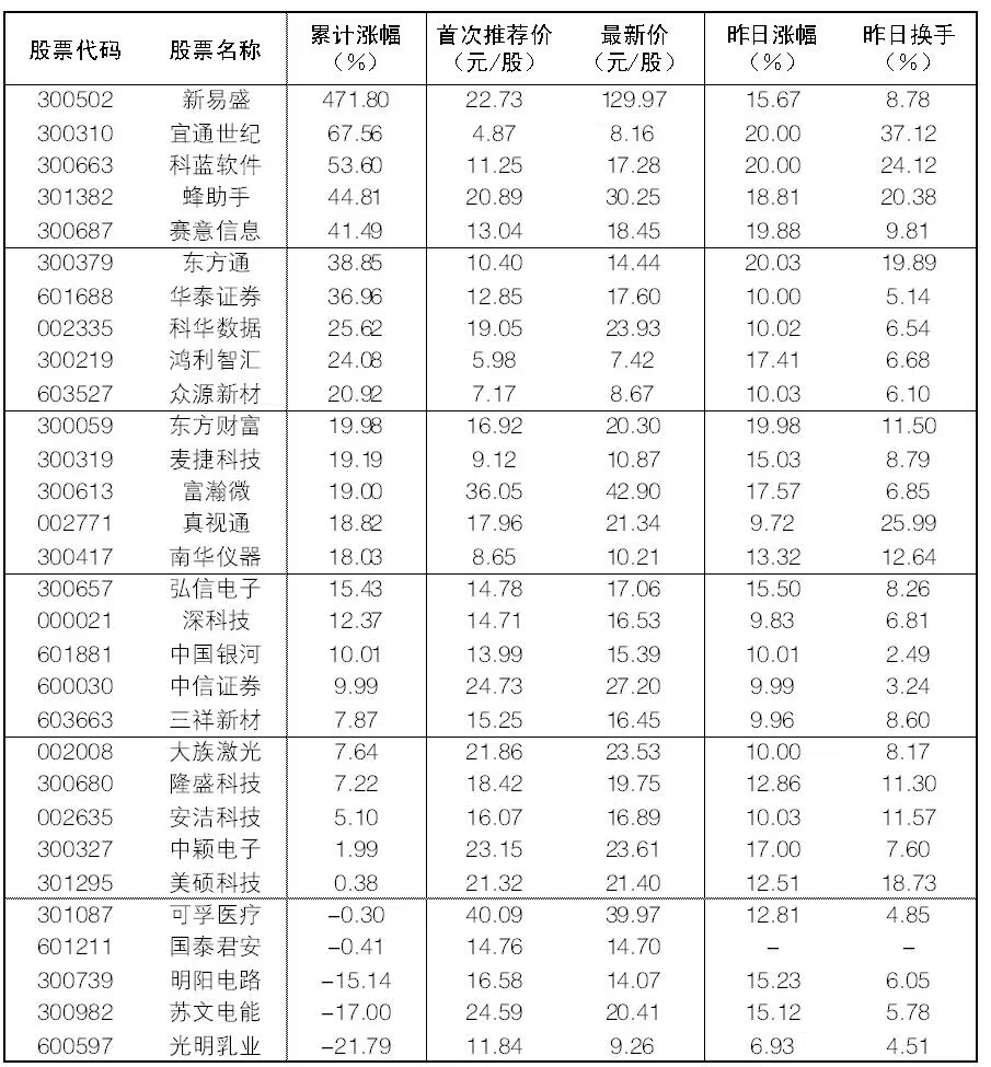 30成份股30日漲幅前五位的是東方通、科藍軟件、宜通世紀、東方財富、賽意信息,漲幅分別為20.03%、20%、20%、19.98%、19.88%。