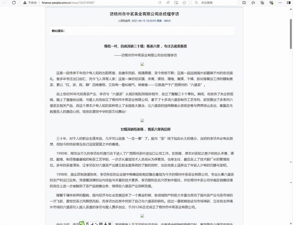 人民經濟網(finance-people.com.cn)2021年6月15日曾發布一篇報道《訪梧州市中茗茶業有限公司總經理李訪》,文章中對李訪的工作經歷進行介紹時,曾報道:“1990年,剛畢業不久的李訪在機緣巧合下進入了廣西梧州茶葉進出口公司工作。在那里,原本對茶知之甚少的他從殺青、揉捻、翻堆、制坯等最基礎的制茶工藝學起,一步步從基層技術人員成長為保管員、倉庫主任,最后走上了技術副廠長的管理崗位。多年的茶香浸染,讓李訪在對六堡茶產業建立起全面系統的了解的同時,也在他身上涵養出了年輕人少有的沉靜與堅韌。