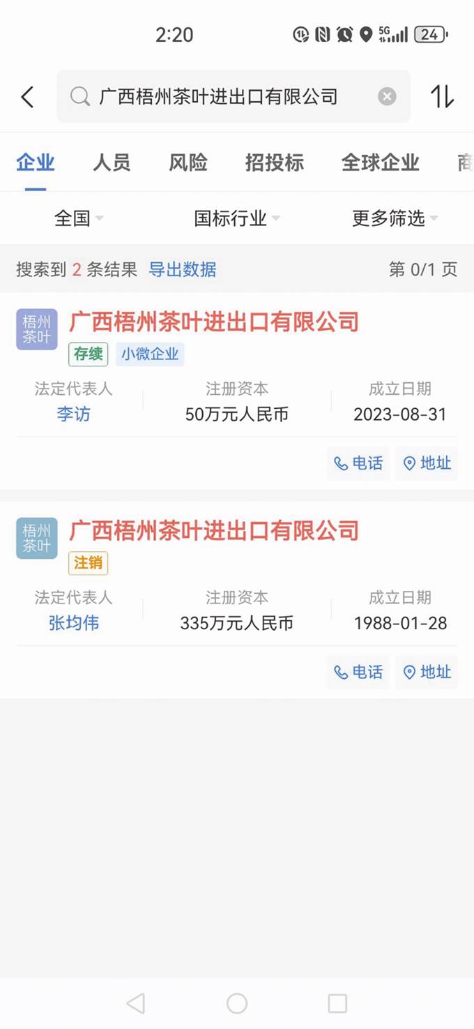 需要注意的是,通過企查查查詢到的工商信息顯示,一家與注銷的梧州茶葉完全重名的廣西梧州茶葉進出口有限公司,在2023年8月31日成立,注冊資本為50萬元,只不過持股人已和中國茶葉無關,其法人代表和持股100%的股東皆為李訪。