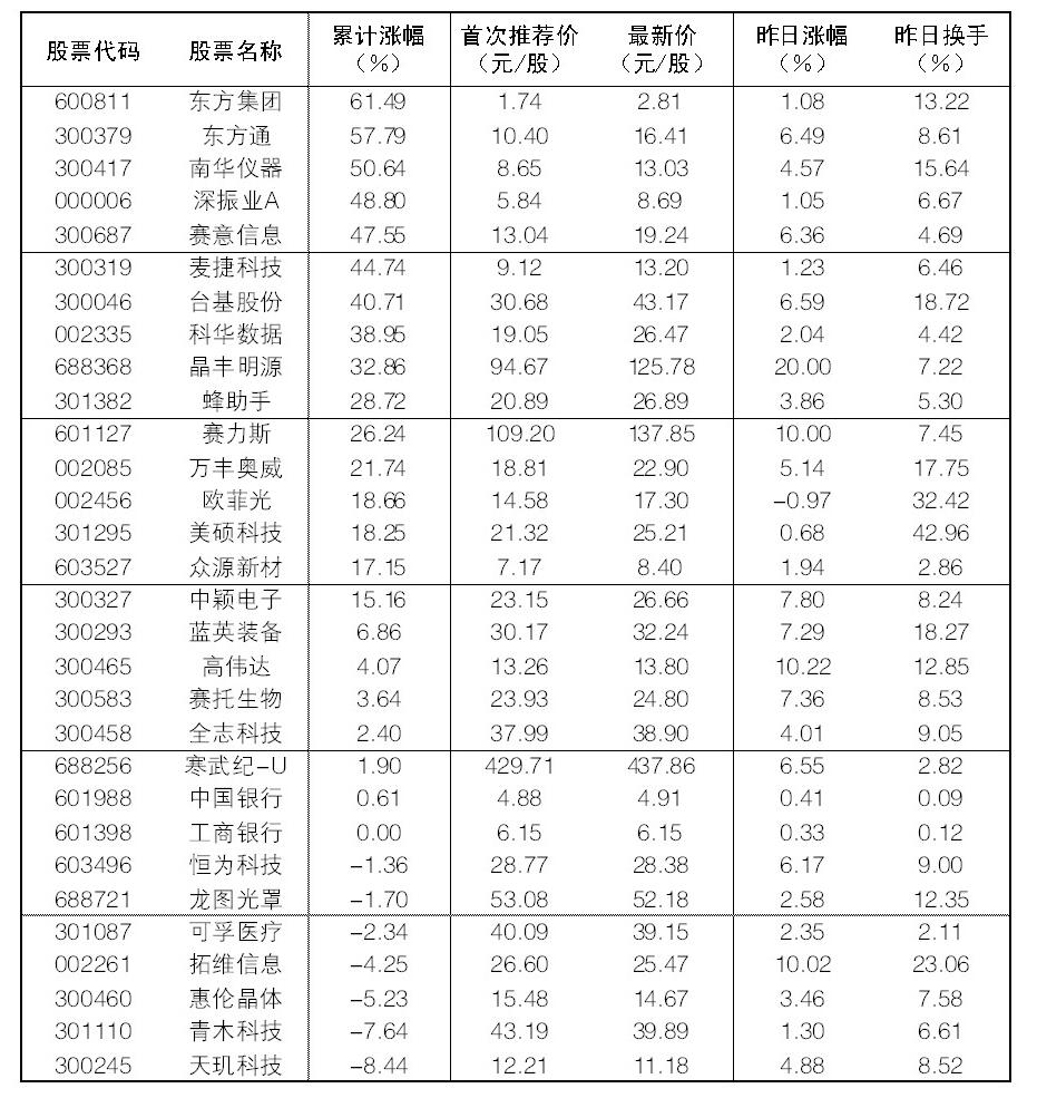 30成份股5日漲幅前五位的是晶豐明源、高偉達、拓維信息、賽力斯、中穎電子,漲幅分別為20.00%、10.22%、10.02%、10.00%、7.80%;跌幅方面,歐菲光小幅下跌0.97%。