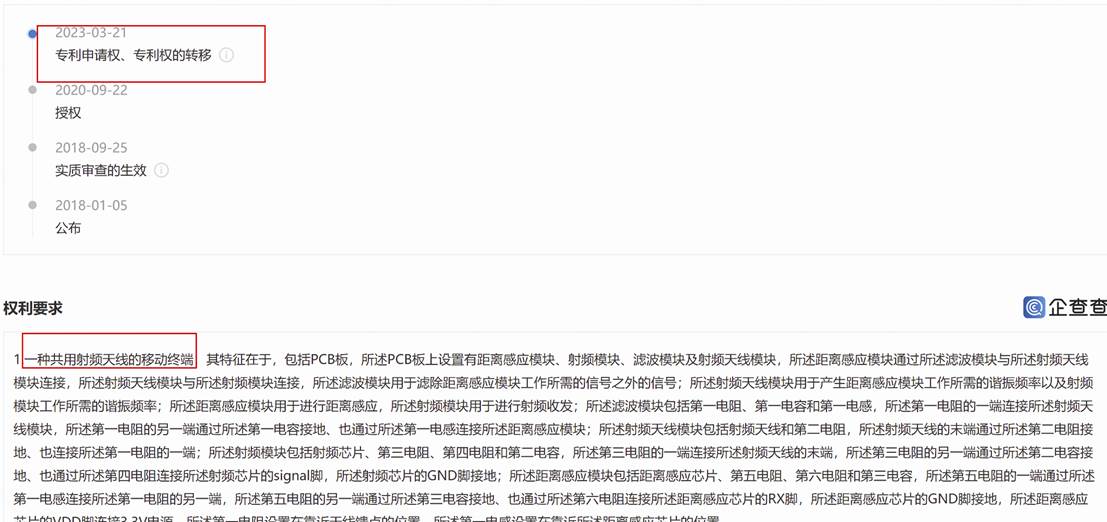 一種共用射頻天線的移動終端專利轉移情況企查查截圖