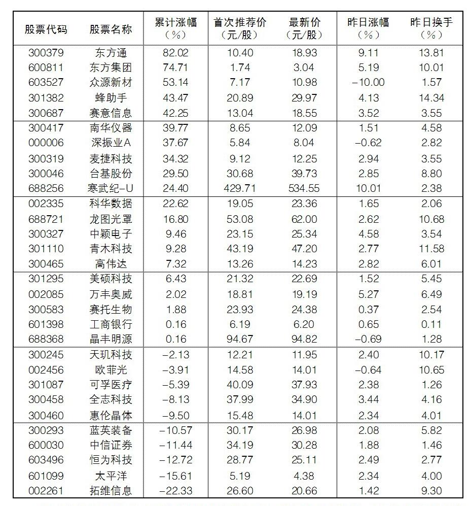 30成份股27日漲幅前五位的是寒武紀-U、東方通、萬豐奧威、東方集團、中穎電子,漲幅分別為10.01%、9.11%、5.27%、5.19%、4.58%;跌幅方面,眾源新材、晶豐明源、歐菲光跌幅居前。