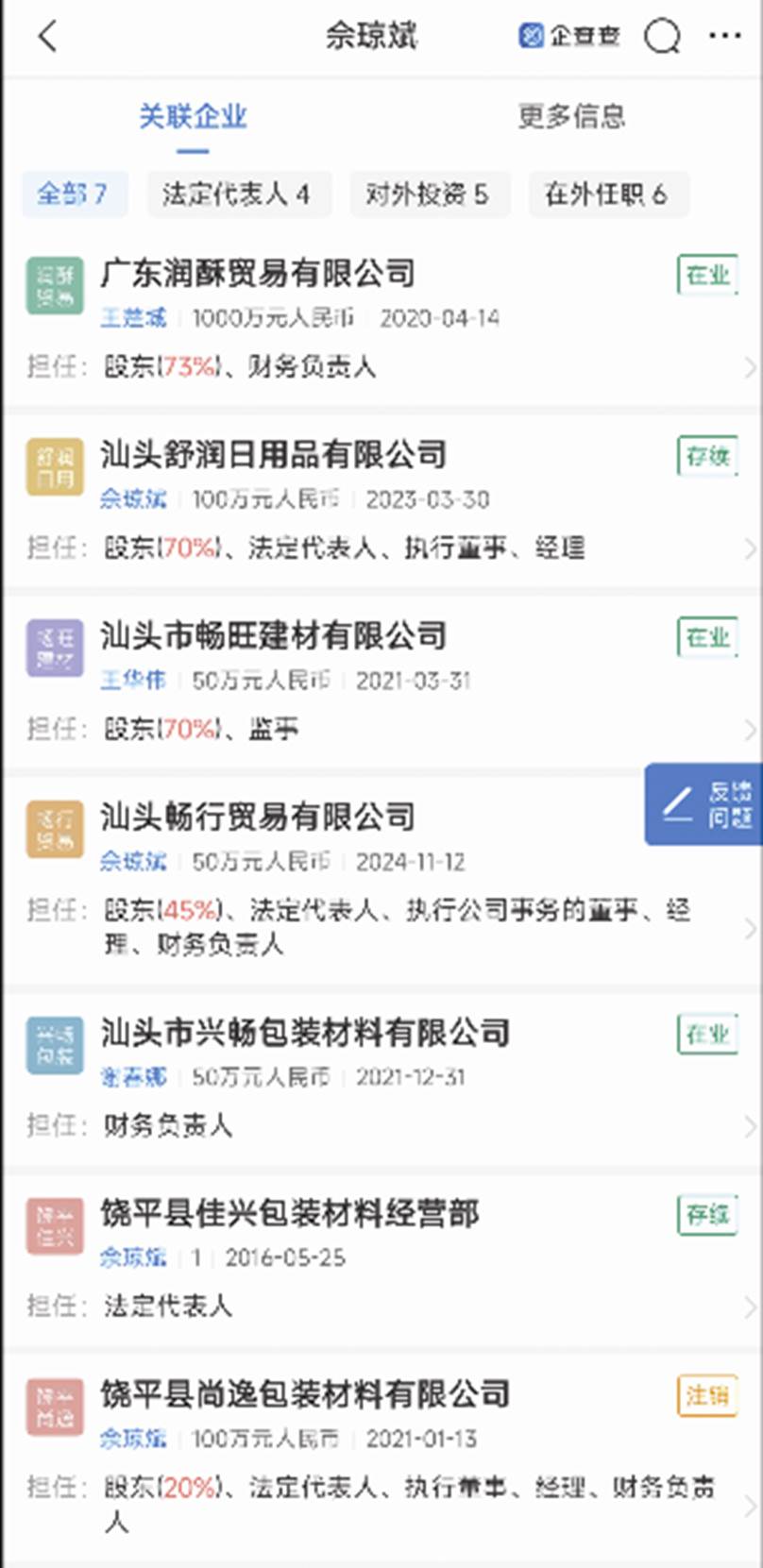 公司此次IPO首次披露招股書申報稿時間及簽署日為2023年8月,通過國家企信平臺和企查查查詢到的工商信息顯示,佘瓊斌在報告期內還控股3家企業(見圖一)——廣東潤酥貿易有限公司,2020年4月成立,佘瓊斌持股73%且擔任財務負責人;汕頭舒潤日用品有限公司,2023年3月成立,佘瓊斌持股70%且擔任法定代表人、執行董事、經理;汕頭市暢旺建材有限公司,2021年3月成立,佘瓊斌持股70%、擔任監事。