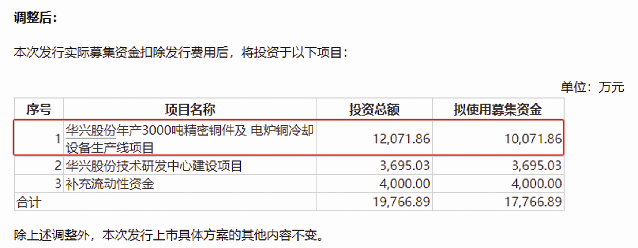 2023年8月首次披露的招股書申報稿(報告期為2020年至2023年一季度)顯示,華興股份此次IPO擬募資2.48億元,計劃用于華興股份年產3000噸精密銅件及電爐銅冷卻設備生產線項目、華興股份技術研發中心建設項目、補充流動性資金,分別使用募資12071.86萬元、3695.03萬元和9000萬元(見圖一)。三個募投項目的總投資額均與擬使用募資額相同。