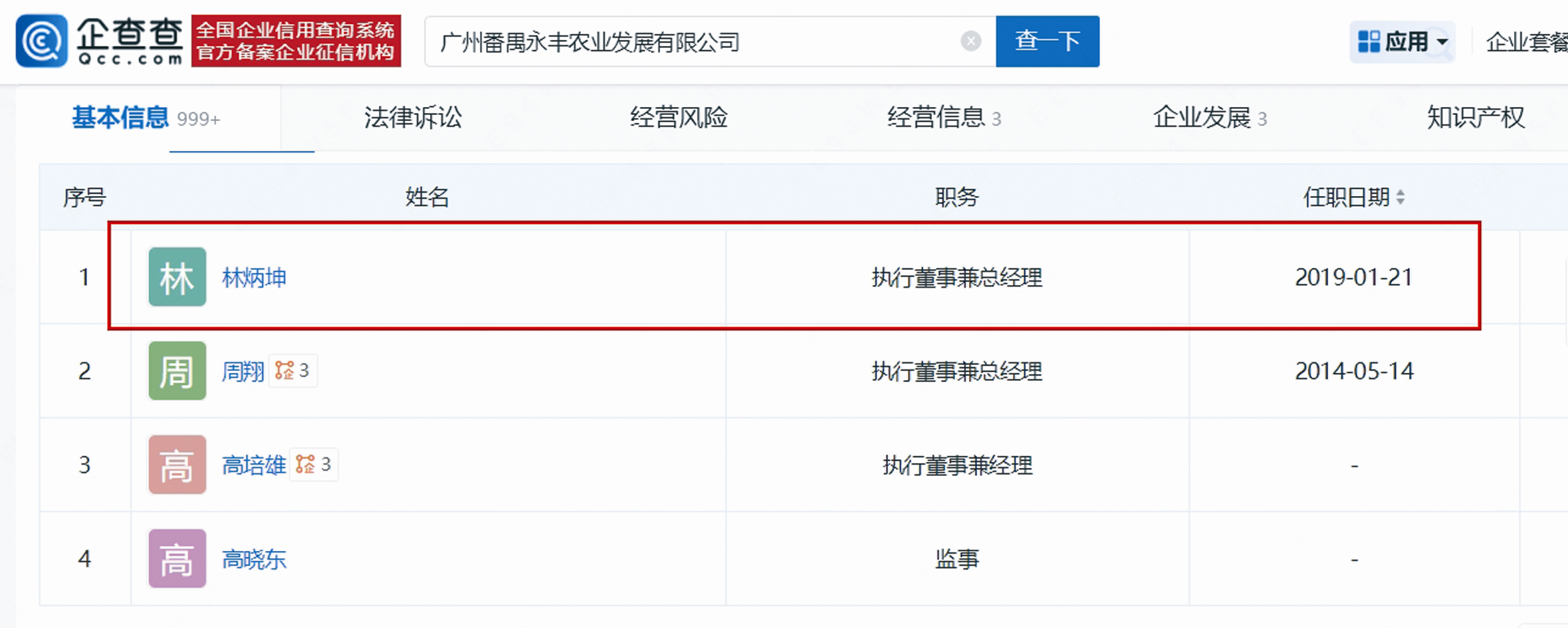 查詢發現,2019年1月至2021年3月,林炳坤登記為廣州番禺永豐農業發展有限公司的執行董事兼總經理。