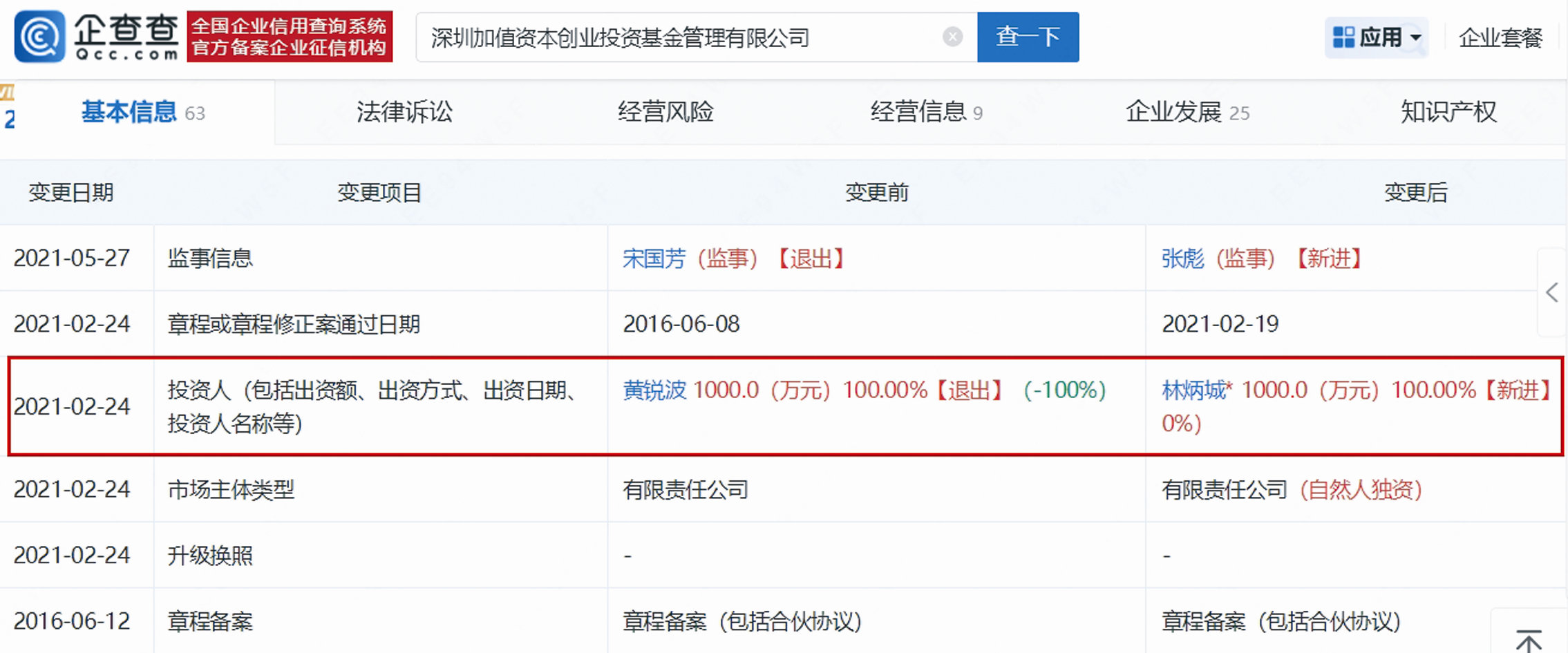 深圳加值資本創業投資基金管理有限公司變更記錄