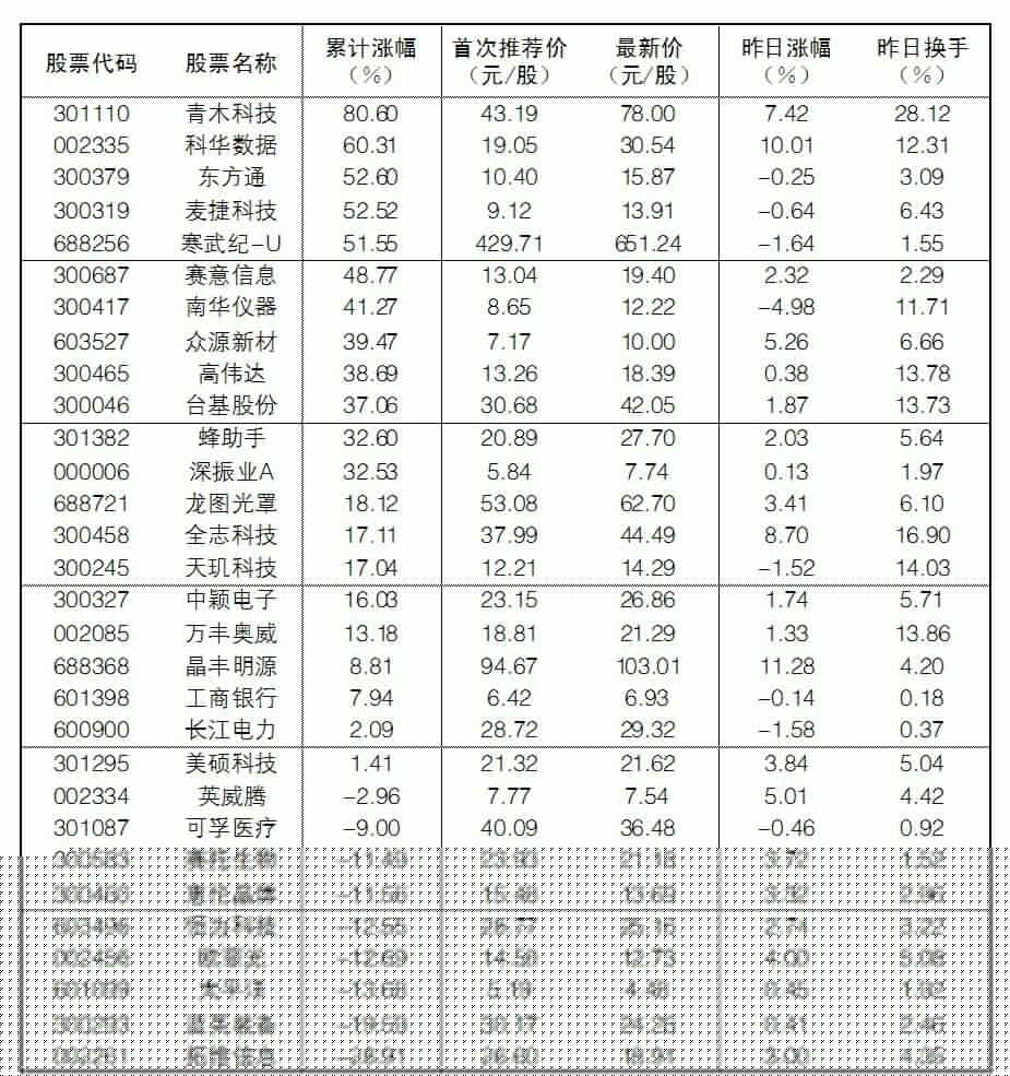 30成份股26日漲幅前五位的是晶豐明源、科華數(shù)據(jù)、全志科技、青木科技、眾源新材,漲幅分別為11.28%、10.01%、8.70%、7.42%、5.26%;跌幅方面,南華儀器、寒武紀(jì)-U、長江電力跌幅居前。