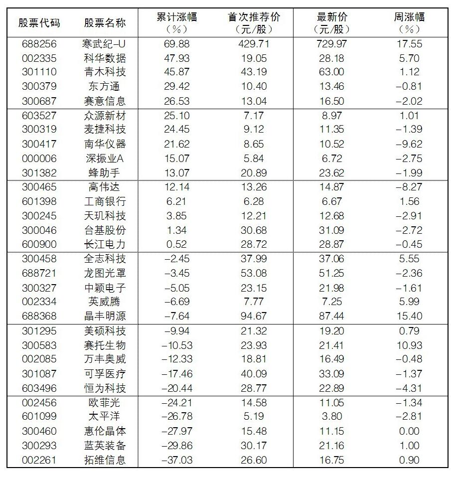 30成份股本周漲幅前五位的是寒武紀(jì)-U、晶豐明源、賽托生物、英威騰、科華數(shù)據(jù),漲幅分別為17.55%、15.40%、10.94%、5.99%、5.70%;跌幅方面,南華儀器、高偉達(dá)、恒為科技、天璣科技跌幅居前。