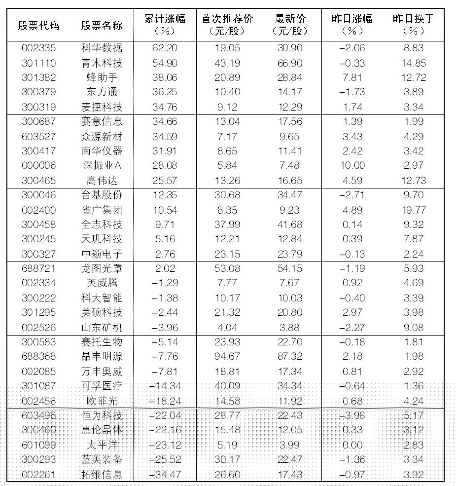 30成份股20日漲幅前五位的是深振業(yè)A、蜂助手、省廣集團、高偉達、眾源新材,漲幅分別為10%、7.81%、4.89%、4.59%、3.43%;跌幅方面,恒為科技、臺基股份、山東礦機跌幅居前。