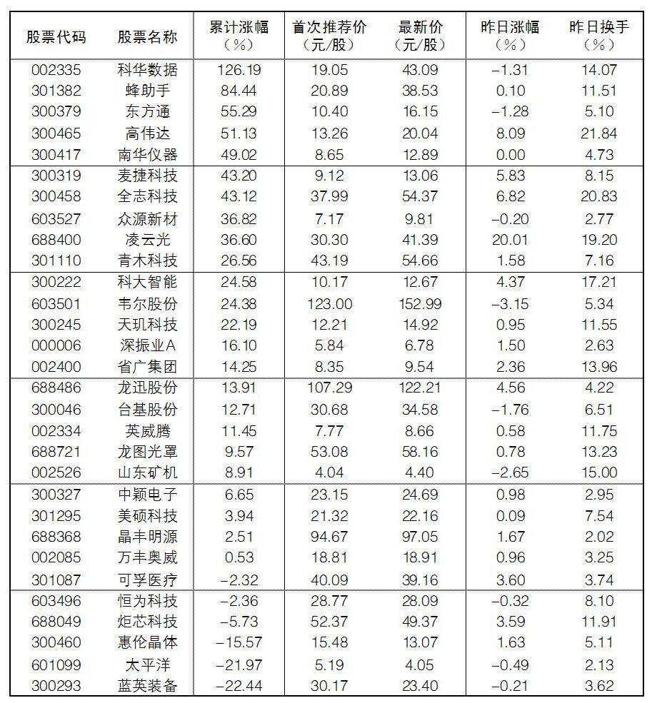 30成份股昨日漲幅前五位的分別是凌云光、高偉達(dá)、全志科技、麥捷科技、龍迅股份,漲幅分別為20.01%、8.09%、6.82%、5.83%、4.56%;跌幅方面,韋爾股份、山東礦機(jī)、臺(tái)基股份跌幅居前。