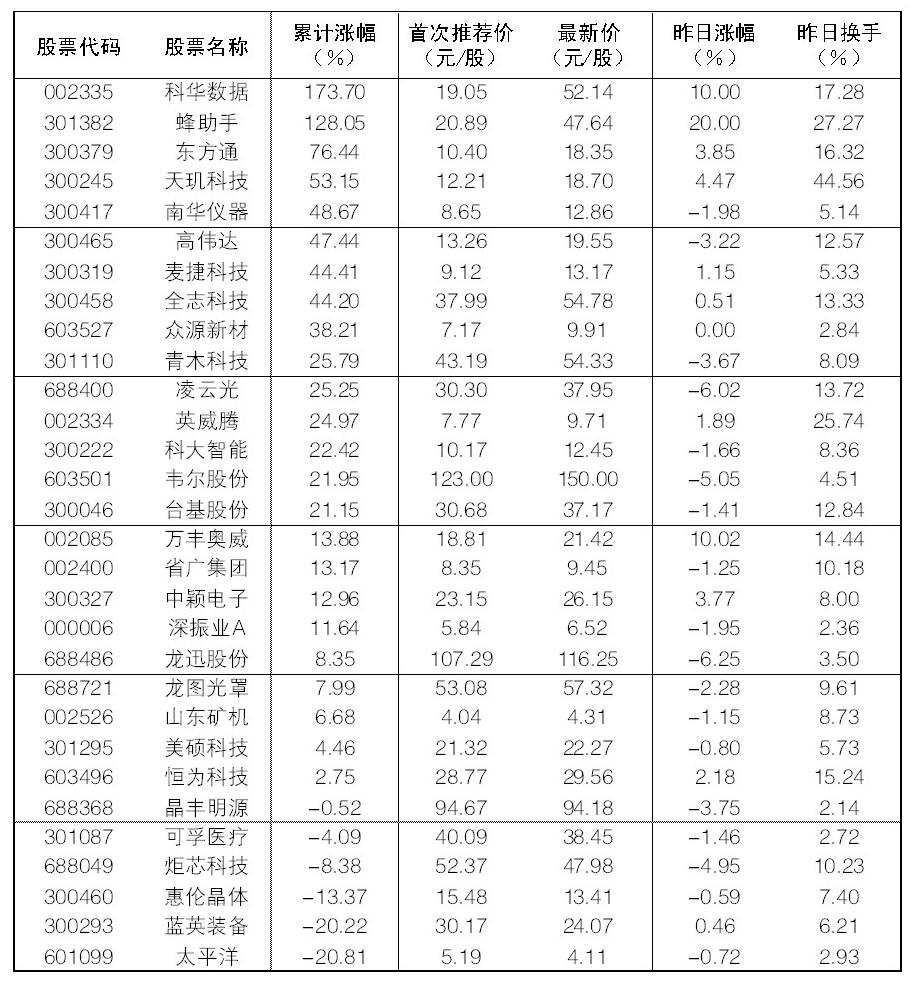 30成份股24日漲幅前五位的分別是蜂助手、萬豐奧威、科華數(shù)據(jù)、天璣科技、東方通,漲幅分別為20%、10.02%、10%、4.47%、3.85%;跌幅方面,龍迅股份、凌云光、韋爾股份、炬芯科技跌幅居前。
