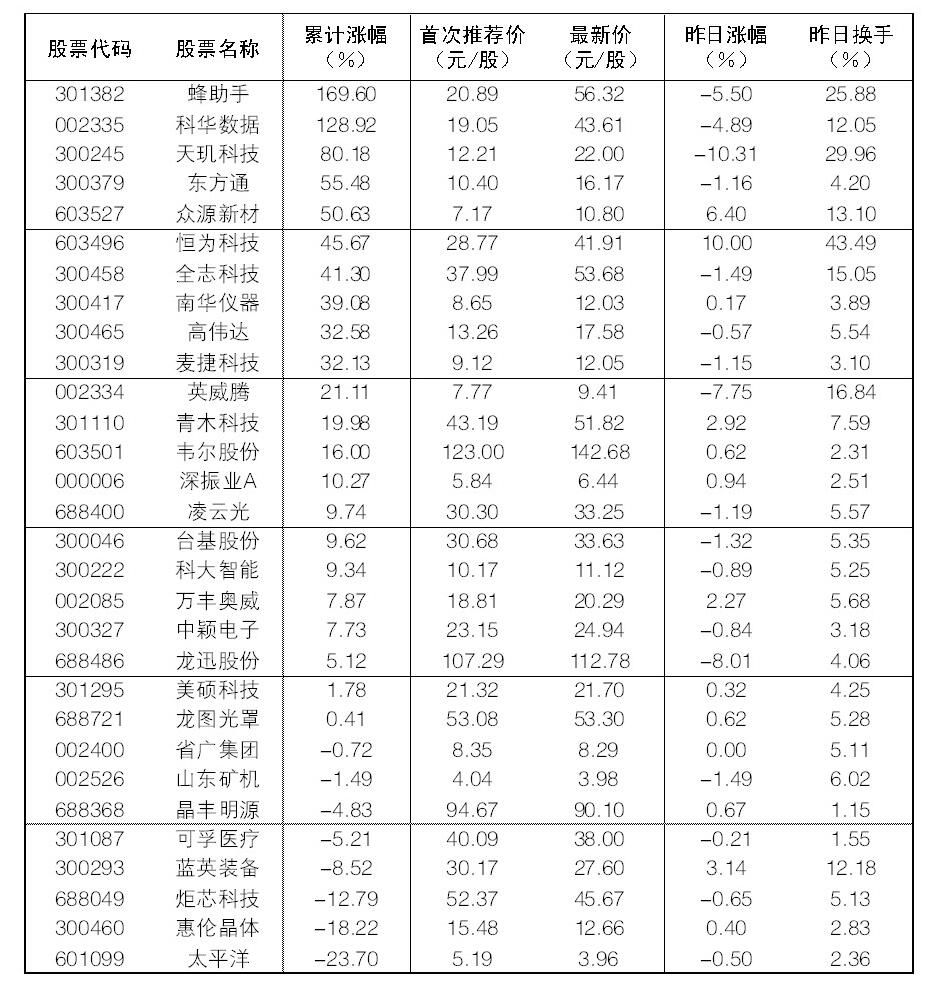 30成份股3日漲幅前五位的分別是恒為科技、眾源新材、藍英裝備、青木科技、萬豐奧威,漲幅分別為10%、6.40%、3.14%、2.92%、2.27%;跌幅方面,天璣科技、龍迅股份、英威騰、蜂助手跌幅居前。