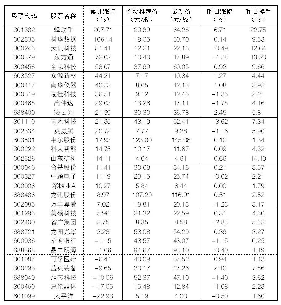 30成份股10日漲幅前五位的分別是蜂助手、凌云光、藍英裝備、眾源新材、南華儀器,漲幅分別為6.71%、2.45%、2.10%、1.27%、1.08%;跌幅方面,東方通、青木科技、省廣集團跌幅居前。