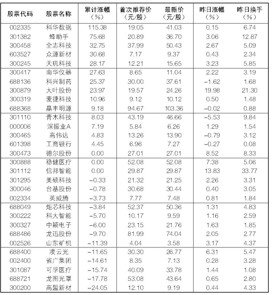 30成份股29日漲幅前五位的分別是大葉股份、凌云光、惠倫晶體、天璣科技、山東礦機,漲幅分別為19.98%、6.31%、5.68%、3.23%、3.17%;跌幅方面,青木科技、科興制藥、高偉達跌幅居前。