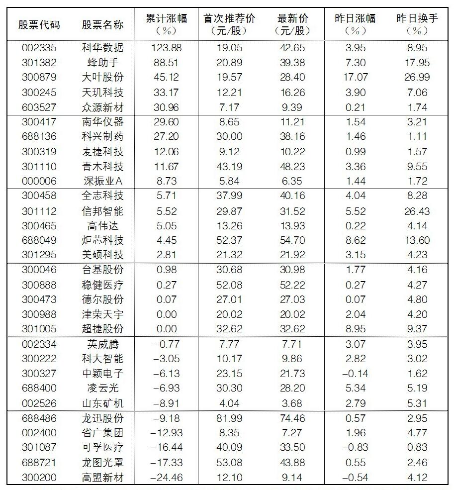 30成份股30日漲幅前五位的分別是大葉股份、炬芯科技、蜂助手、信邦智能、凌云光,漲幅分別為17.07%、8.62%、7.30%、5.52%、5.34%;跌幅方面,晶豐明源、工商銀行、可孚醫療跌幅居前。