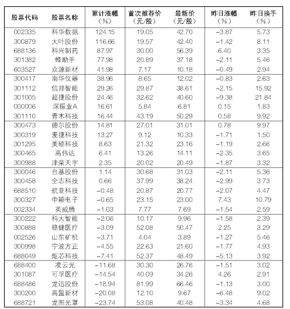 大眾30指數成份股中,10日漲幅前五位的分別是中穎電子、科興制藥、可孚醫療、穩健醫療、德爾股份,漲幅分別為7.43%、6.40%、4.26%、2.25%、0.78%;跌幅方面,超捷股份、高盟新材、炬芯科技、科華數據等跌幅居前。