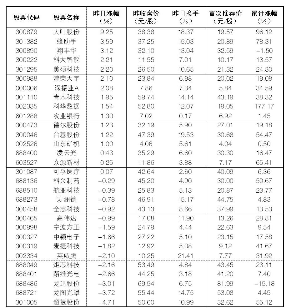 大眾30指數成份股中,19日漲幅前五位的分別是大葉股份、蜂助手、翔豐華、科大智能、美碩科技,漲幅分別為9.25%、3.59%、3.12%、2.21%、2.20%;跌幅方面,超捷股份、龍圖光罩、龍迅股份、路維光電等跌幅居前。