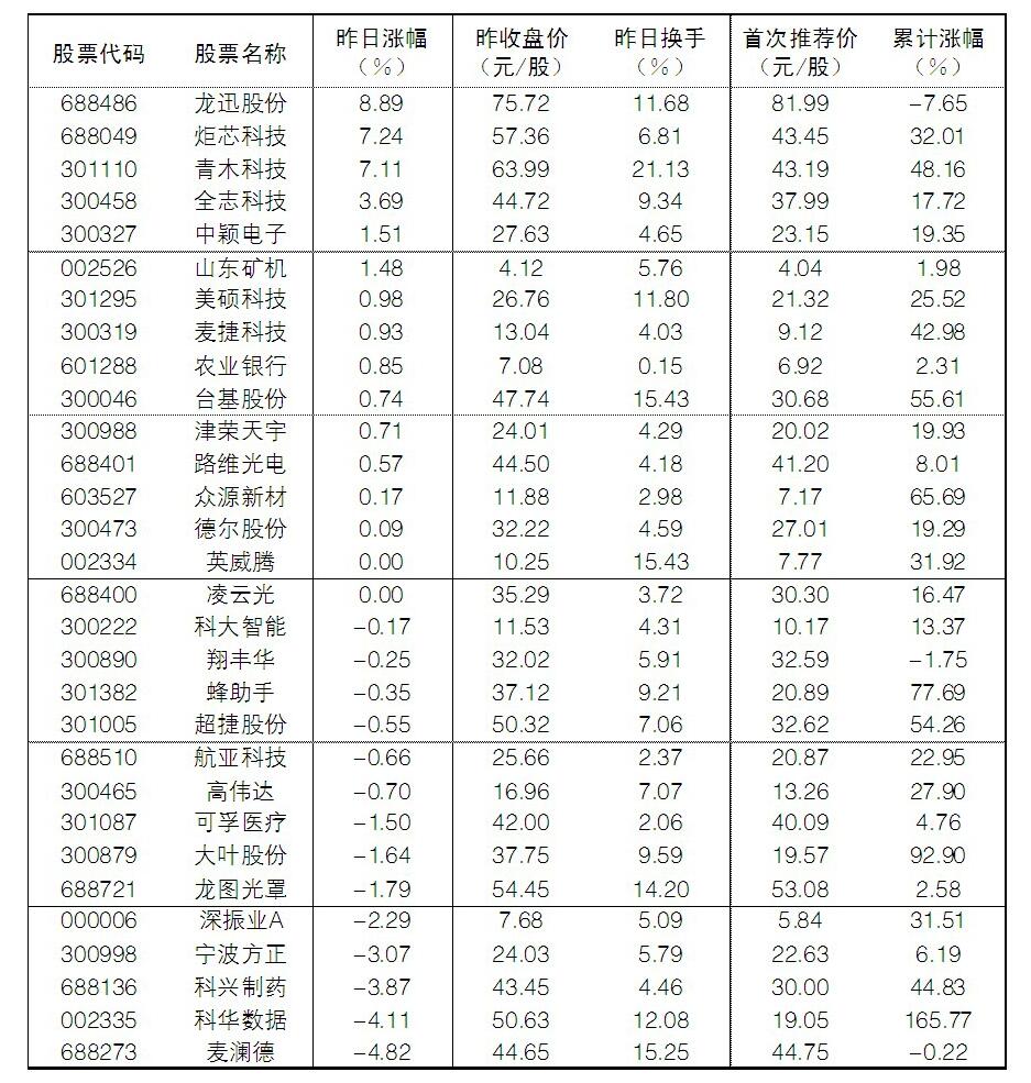 大眾30指數成份股中,20日漲幅前五位的是龍迅股份、炬芯科技、青木科技、全志科技、中穎電子,漲幅分別為8.89%、7.24%、7.11%、3.69%、1.51%;跌幅方面,麥瀾德、科華數據、科興制藥、寧波方正等跌幅居前。