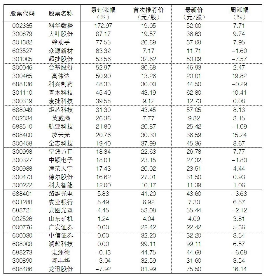 大眾30指數成份股中,本周漲幅前五位的是高偉達、龍迅股份、凌云光、青木科技、大葉股份,漲幅分別為19.82%、16.14%、15.24%、10.41%、9.74%;跌幅榜上,超捷股份、麥瀾德、可孚醫療、路維光電等跌幅居前。