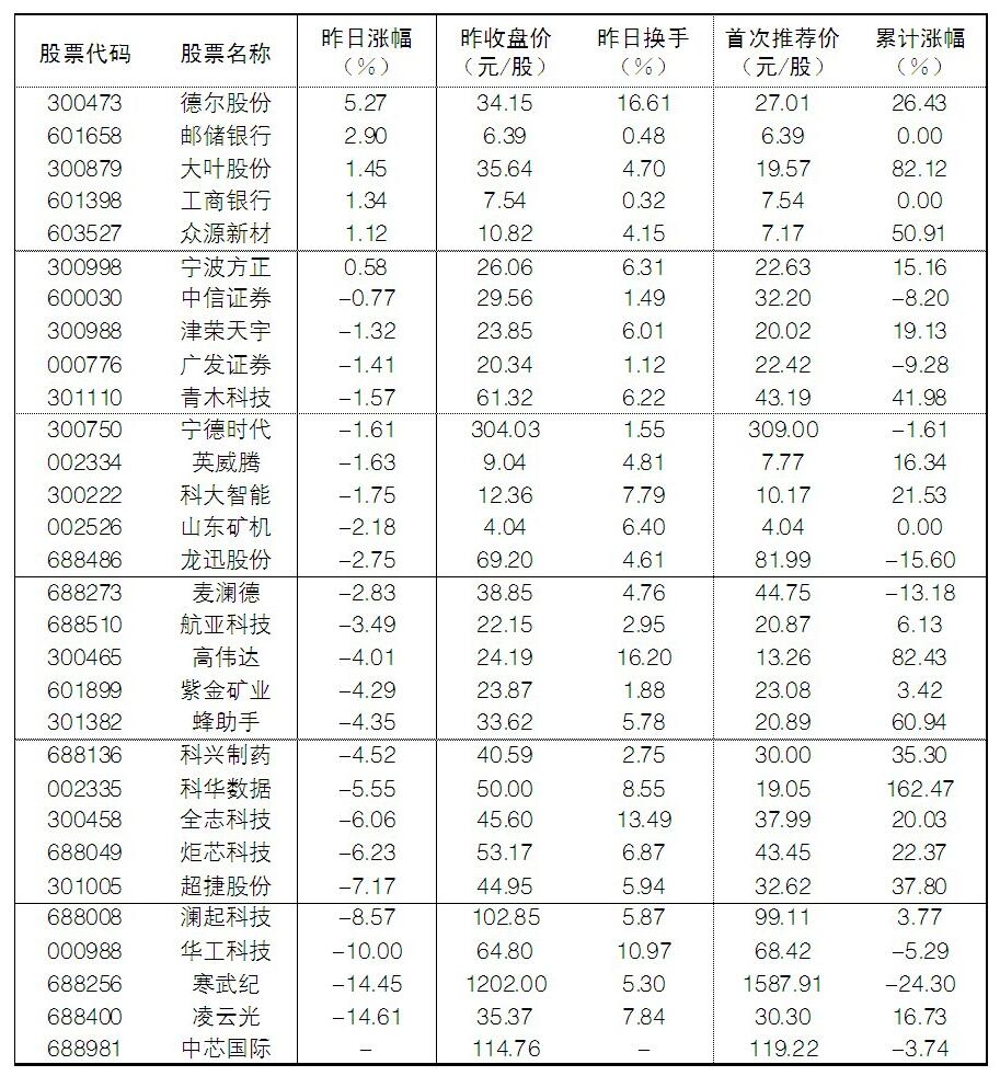 大眾30指數成份股中,4日逆市上漲的分別是德爾股份、大葉股份、眾源新材、寧波方正,漲幅分別為5.27%、1.45%、1.12%、0.58%;跌幅榜上,凌云光、寒武紀、華工科技、瀾起科技跌幅居前。