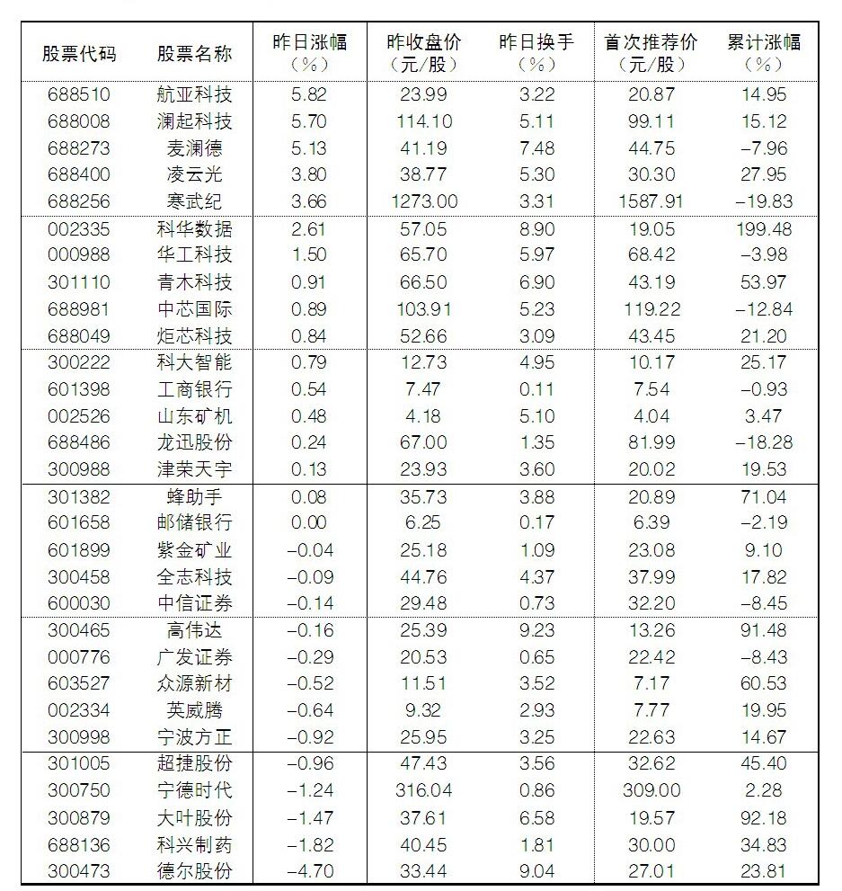 大眾30指數成份股中,10日漲幅前五位的分別是航亞科技、瀾起科技、麥瀾德、凌云光、寒武紀,漲幅分別為5.82%、5.70%、5.13%、3.80%、3.66%;跌幅榜上,德爾股份、科興制藥、大葉股份、寧德時代等跌幅居前。
