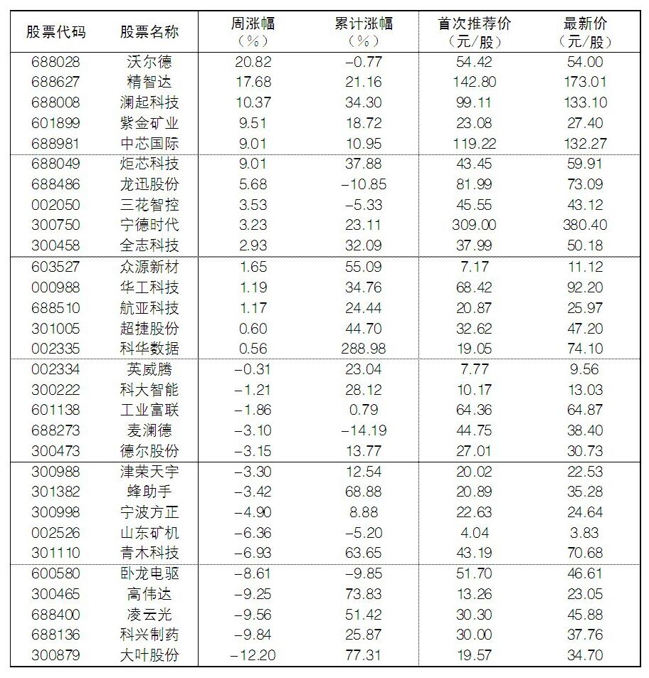大眾30指數成份股中,本周漲幅前五位的分別是沃爾德、精智達、瀾起科技、紫金礦業、中芯國際,漲幅分別為20.82%、17.68%、10.37%、9.51%和9.01%;跌幅榜上,大葉股份、科興制藥、凌云光等跌幅居前。