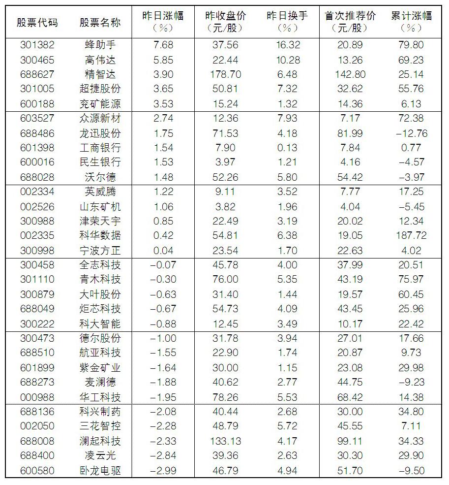 大眾30指數成份股中,3日漲幅前五位的分別是蜂助手、高偉達、精智達、超捷股份、兗礦能源,漲幅分別為7.68%、5.85%、3.90%、3.65%、3.53%;跌幅榜上,臥龍電驅、凌云光、瀾起科技等跌幅居前。