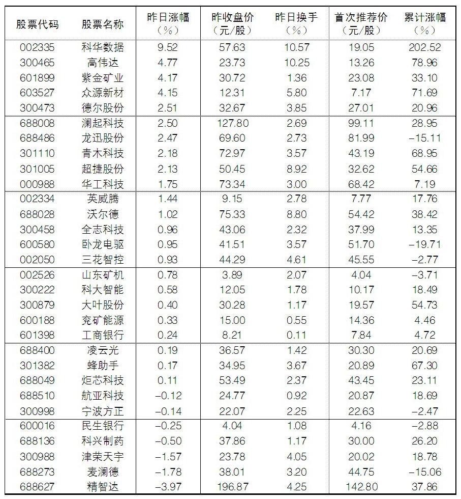 大眾30指數成份股中,13日漲幅前五位的分別是科華數據、高偉達、紫金礦業、眾源新材、德爾股份,漲幅分別為9.52%、4.77%、4.17%、4.15%、2.51%;跌幅榜上,精智達、麥瀾德、津榮天宇等跌幅居前。