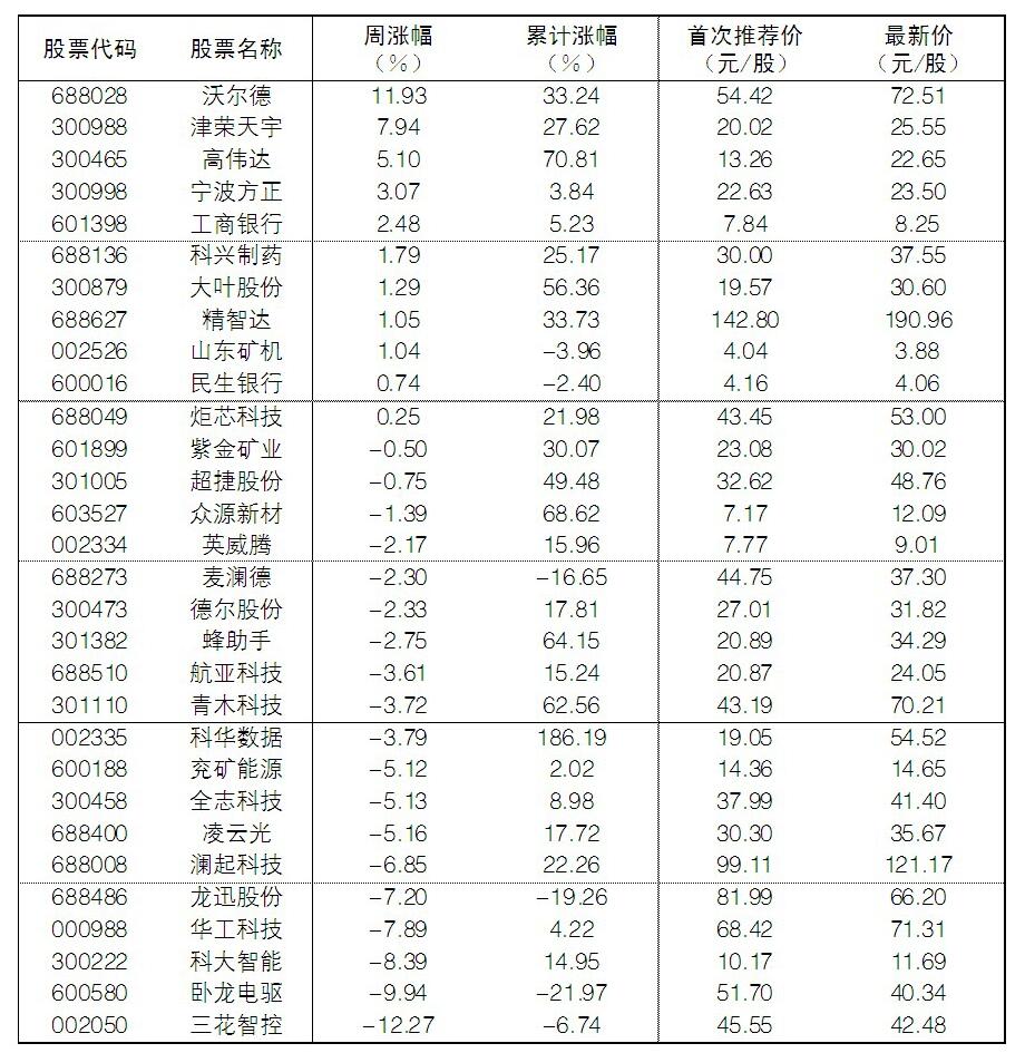 大眾30指數成份股中,本周漲幅前五位的分別是沃爾德、津榮天宇、高偉達、寧波方正、工商銀行,漲幅分別為11.93%、7.94%、5.10%、3.07%和2.48%;跌幅榜上,三花智控、臥龍電驅、科大智能、華工科技等跌幅居前。