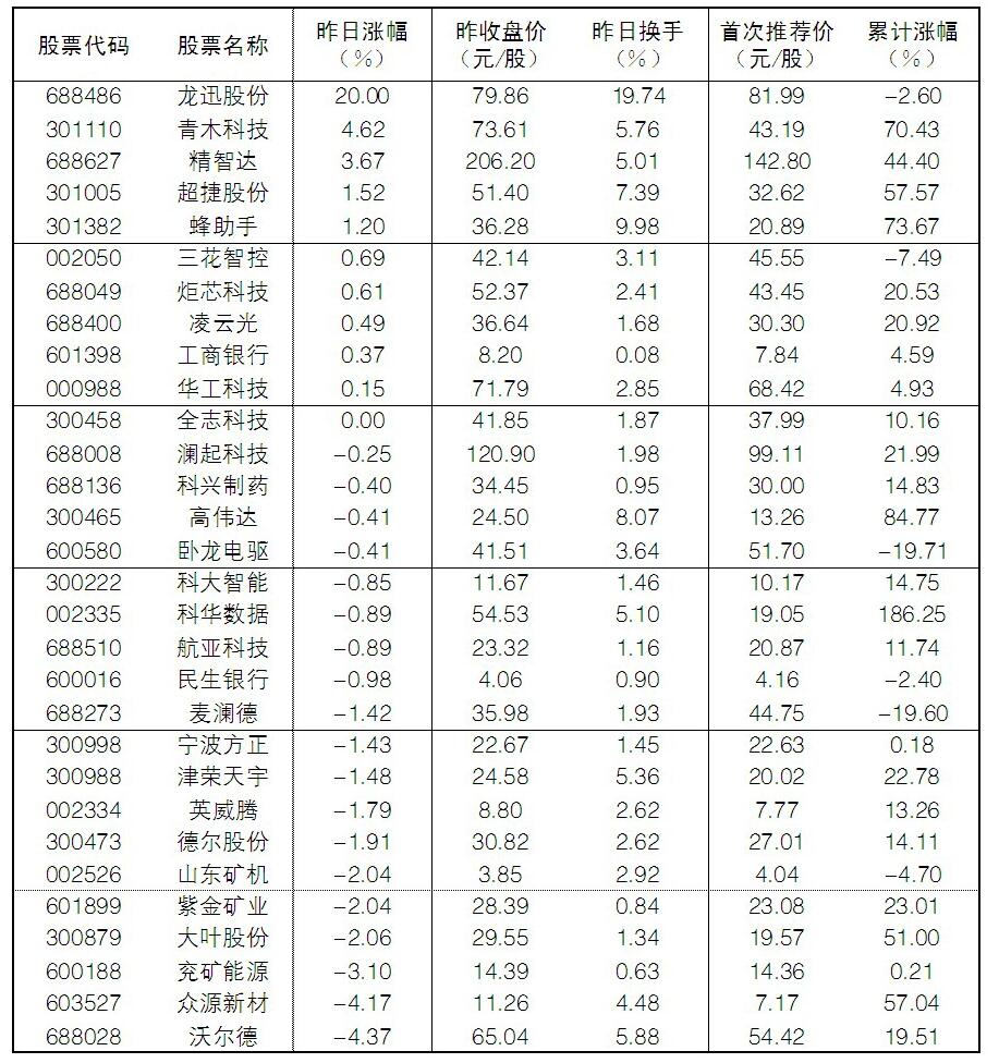 大眾30指數(shù)成份股中,18日漲幅前五位的分別是龍迅股份、青木科技、精智達(dá)、超捷股份、蜂助手,漲幅分別為20.00%、4.62%、3.67%、1.52%、1.20%;跌幅榜上,沃爾德、眾源新材、兗礦能源、大葉股份等跌幅居前。