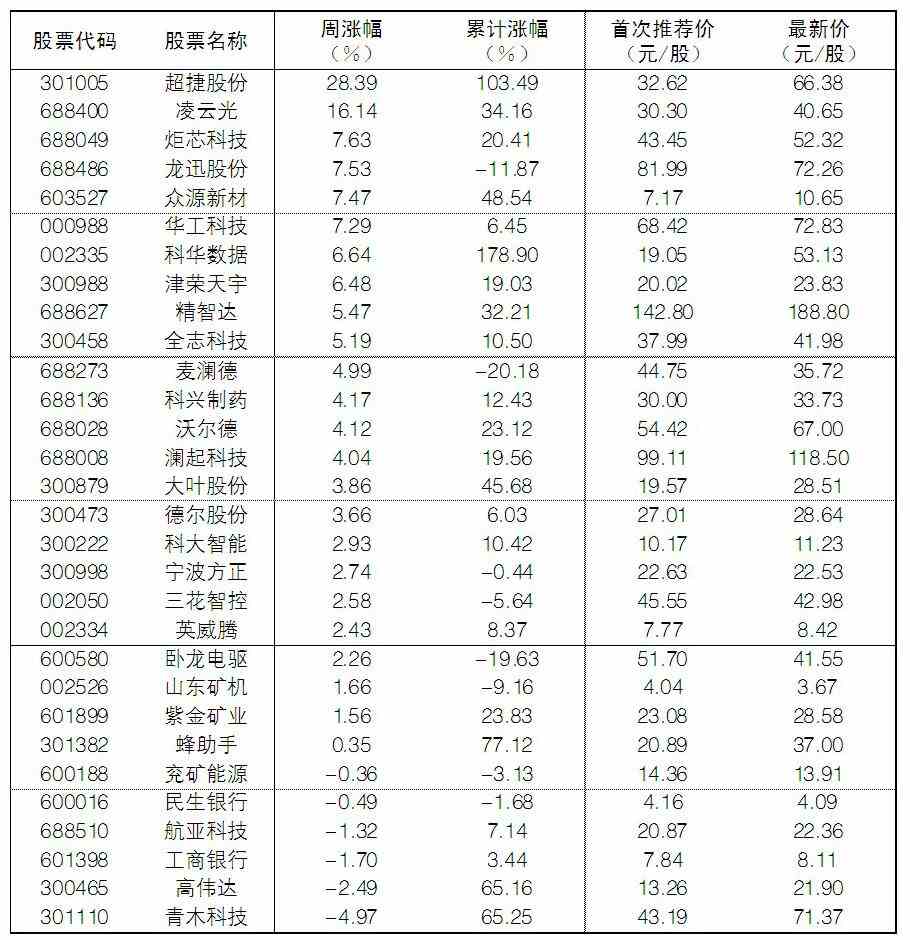 大眾30指數成份股中,本周漲幅前五位的分別是超捷股份、凌云光、炬芯科技、龍迅股份、眾源新材,漲幅分別為28.39%、16.14%、7.63%、7.53%和7.47%;跌幅榜上,青木科技、高偉達、工商銀行、航亞科技等跌幅居前。
