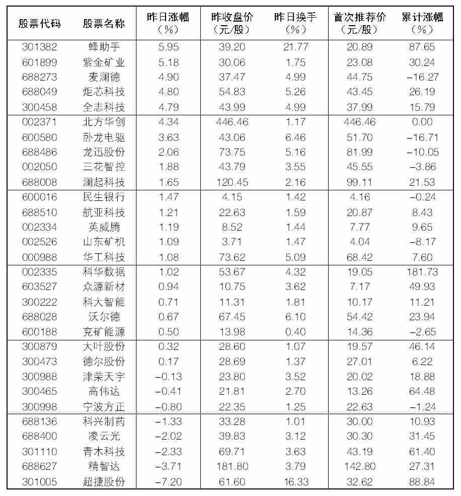 大眾30指數成份股中,1日漲幅前五位的分別是蜂助手、紫金礦業、麥瀾德、炬芯科技、全志科技,漲幅分別為5.95%、5.18%、4.90%、4.80%和4.79%;跌幅榜上,超捷股份、精智達、青木科技、凌云光等跌幅居前。
