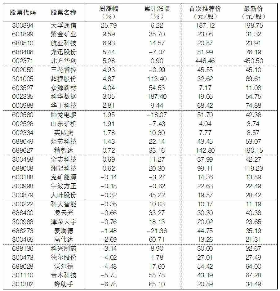 大眾30指數成份股中,本周漲幅前五位的分別是天孚通信、紫金礦業、航亞科技、龍迅股份、北方華創,漲幅分別為25.79%、9.59%、6.93%、5.44%和5.28%;跌幅榜上,蜂助手、青木科技、沃爾德、德爾股份等跌幅居前。