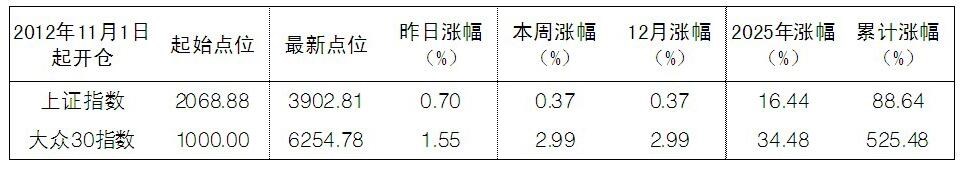 本報綜合消息 本周,大盤呈現探底回升的走勢,上證綜指上漲0.37%,深證成指上漲1.26%,創業板指上漲1.86%,大眾30指數上漲2.99%。