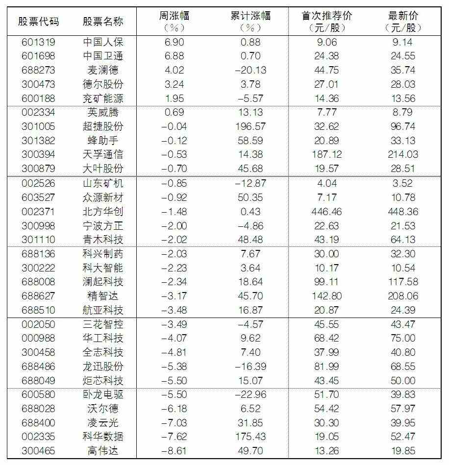 大眾30指數成份股中,本周漲幅前五位的分別是中國人保、中國衛通、麥瀾德、德爾股份、兗礦能源,漲幅分別為6.90%、6.88%、4.02%、3.24%和1.95%;跌幅榜上,高偉達、科華數據、凌云光、沃爾德等跌幅居前。