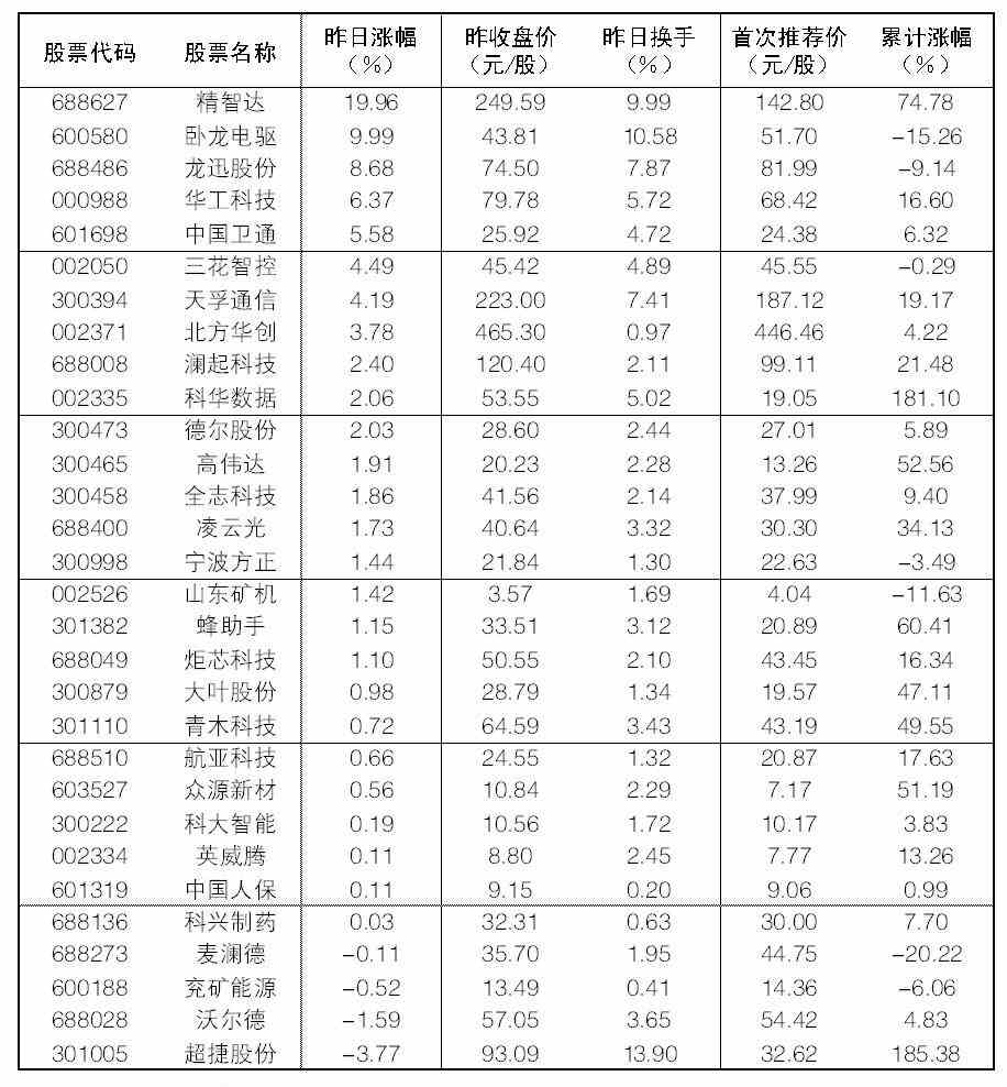 大眾30指數成份股中,22日漲幅前五位的分別是精智達、臥龍電驅、龍迅股份、華工科技、中國衛通,漲幅分別為19.96%、9.99%、8.68%、6.37%和5.58%;跌幅榜上,超捷股份、沃爾德、兗礦能源等跌幅居前。