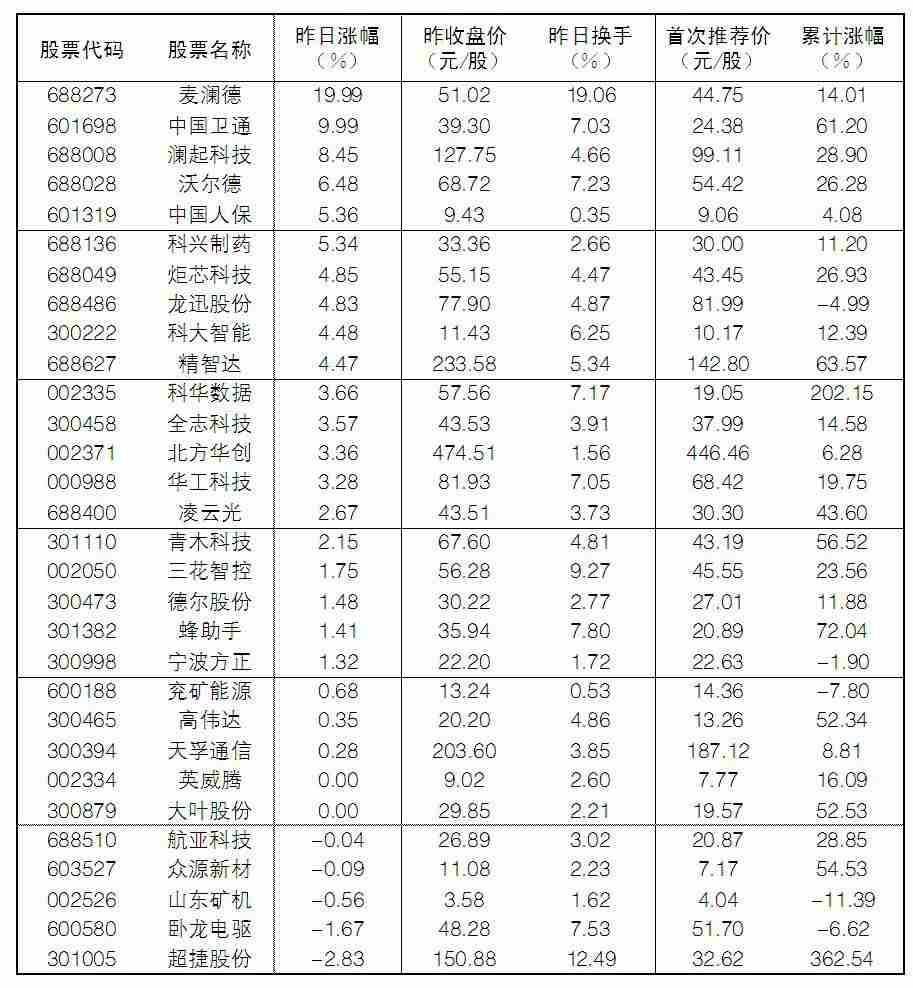 大眾30指數(shù)成份股中,5日漲幅前五位的分別是麥瀾德、中國(guó)衛(wèi)通、瀾起科技、沃爾德、中國(guó)人保,漲幅分別為19.99%、9.99%、8.45%、6.48%和5.36%;跌幅榜上,超捷股份、臥龍電驅(qū)、山東礦機(jī)、眾源新材等跌幅居前。