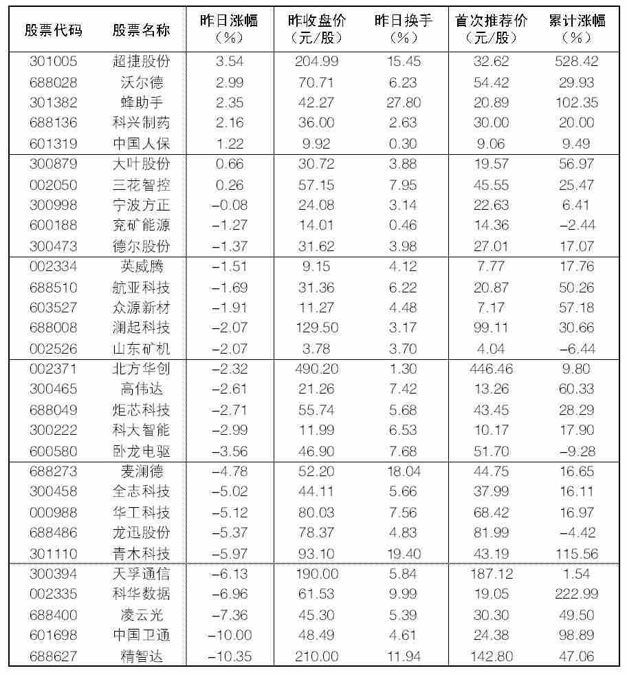 大眾30指數成份股中,13日漲幅前五位的分別是超捷股份、沃爾德、蜂助手、科興制藥、中國人保,漲幅分別為3.54%、2.99%、2.35%、2.16%、1.22%;跌幅榜上,精智達、中國衛通、凌云光、科華數據、天孚通信等跌幅居前。