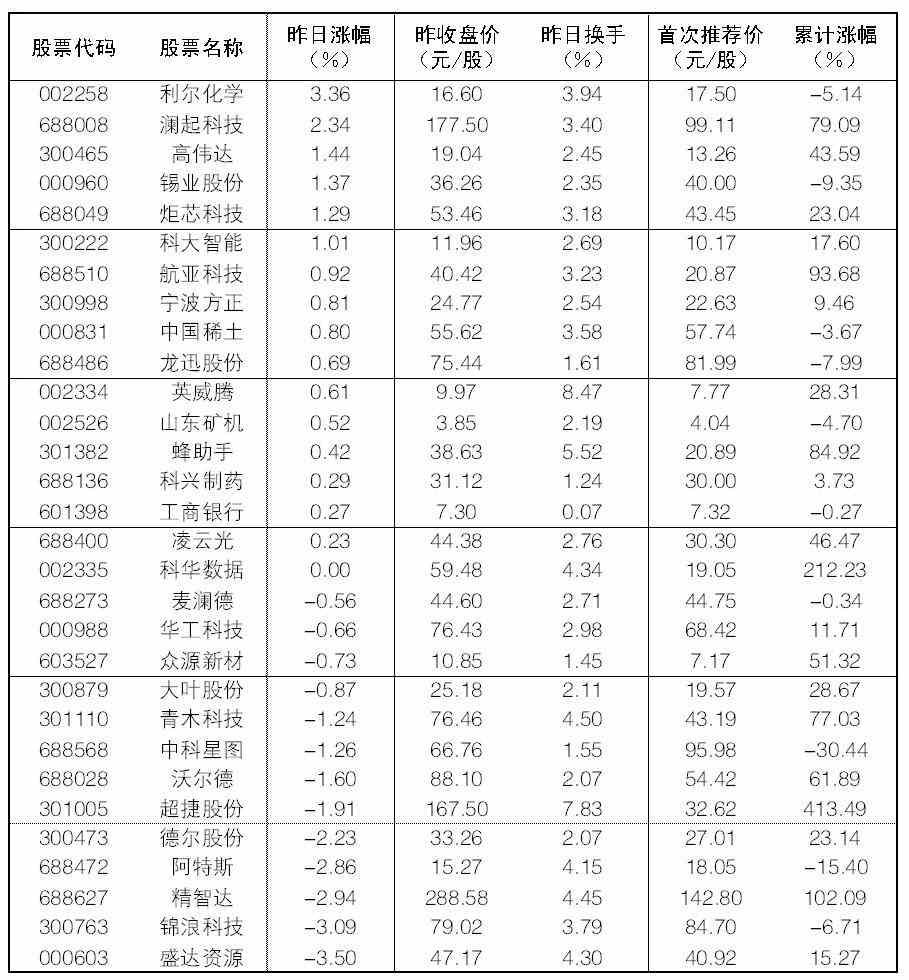 大眾30指數(shù)成份股中,10日漲幅前五位的分別是利爾化學(xué)、瀾起科技、高偉達(dá)、錫業(yè)股份、炬芯科技,漲幅分別為3.36%、2.34%、1.44%、1.37%、1.29%;跌幅榜上,盛達(dá)資源、錦浪科技、精智達(dá)、阿特斯等跌幅居前。