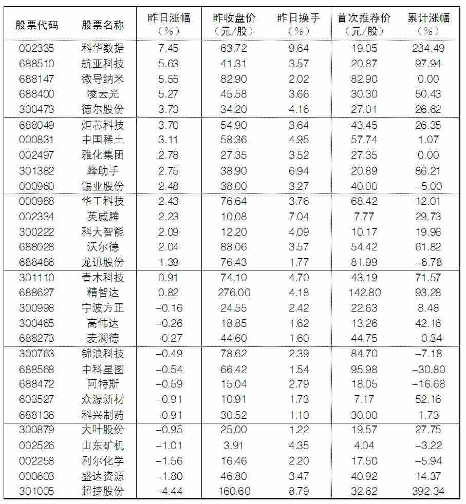 大眾30指數(shù)成份股中,12日漲幅前五位的分別是科華數(shù)據(jù)、航亞科技、凌云光、德爾股份、炬芯科技,漲幅分別為7.45%、5.63%、5.27%、3.73%、3.70%;跌幅榜上,超捷股份、盛達(dá)資源、利爾化學(xué)等跌幅居前。