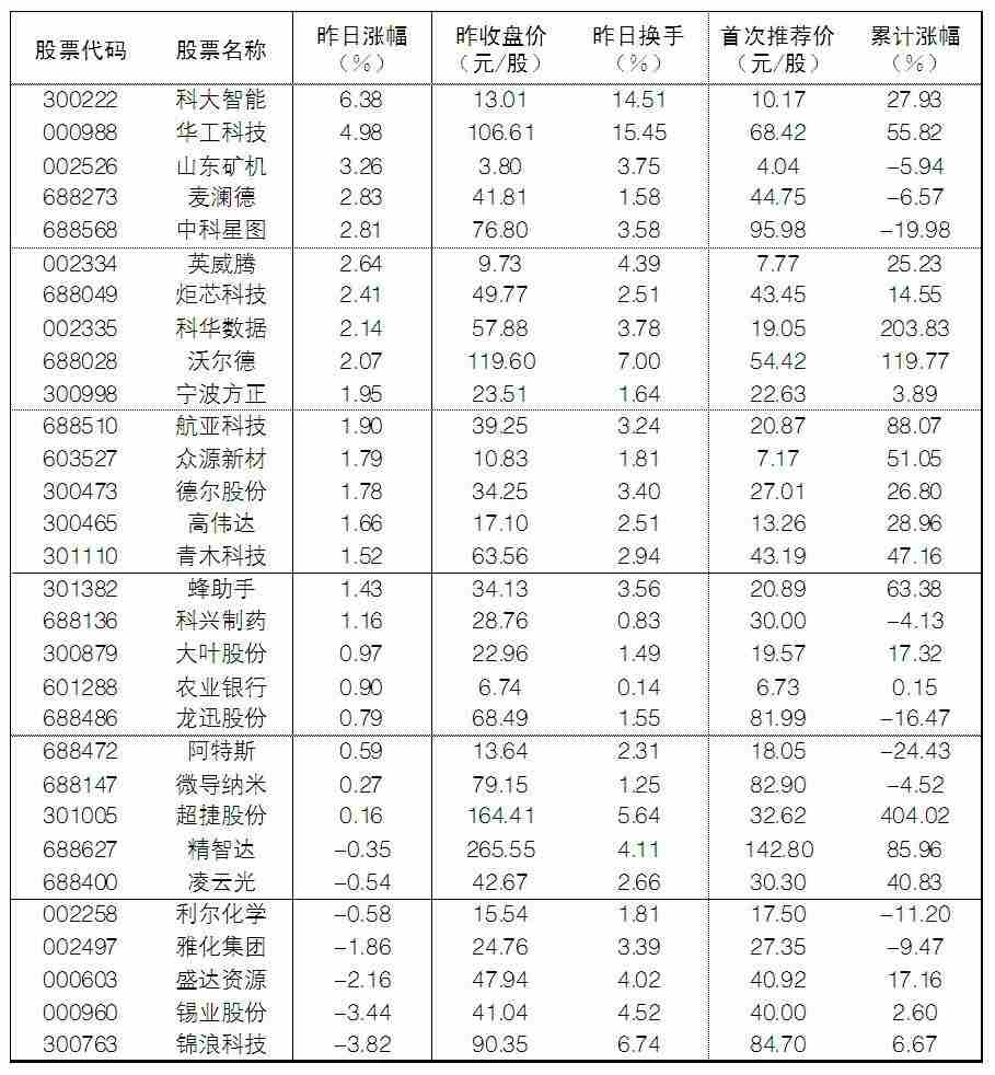 大眾30指數成份股中,5日漲幅前五位的分別是科大智能、華工科技、山東礦機、麥瀾德、中科星圖,漲幅分別為6.38%、4.98%、3.26%、2.83%和2.81%;跌幅榜上,錦浪科技、錫業股份、盛達資源、雅化集團等跌幅居前。