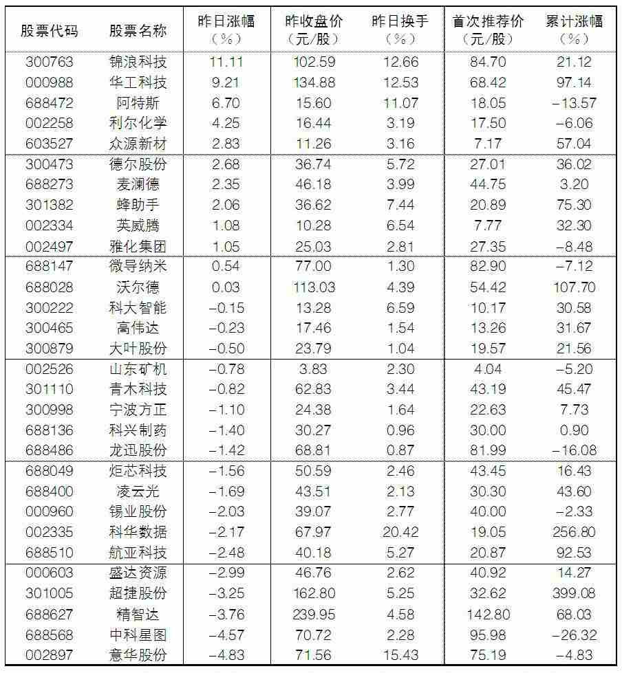 大眾30指數成份股中,11日漲幅前五位的分別是錦浪科技、華工科技、阿特斯、利爾化學、眾源新材,漲幅分別為11.11%、9.21%、6.70%、4.25%和2.83%;跌幅榜上,意華股份、中科星圖、精智達、超捷股份等跌幅居前。